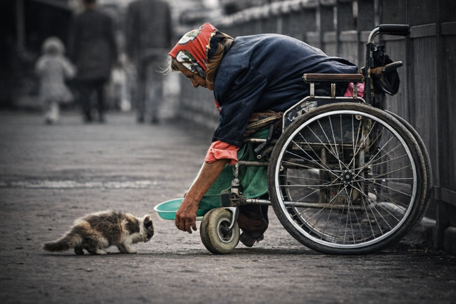 Старушка в инвалидном кресле кормит бездомного котенка